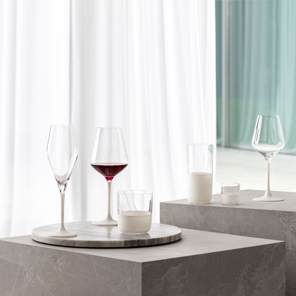 The partially hand-painted glasses in matt white are characterized by cool elegance and perfect functionality in an exclusive, stylish design, making a strong statement in the home cocktail bar.